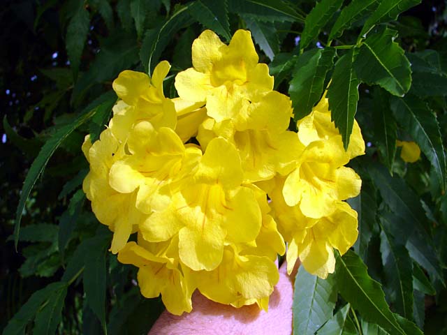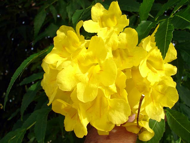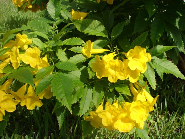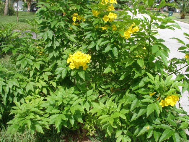 So easy, Yellow Elder can be kept pruned as a shrub... or allowed to grow into a small tree, 12-15 feet tall ...as you like Flowers are formed in clusters. Clusters are numerous and you don't have to do anything special to enjoy Nice leaf color and shape too Easy in lawn areas, dry areas